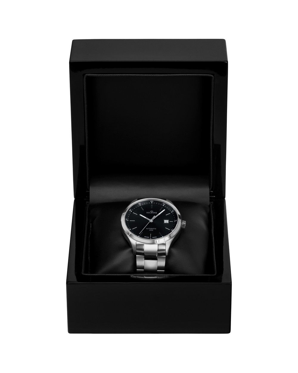 Dette er et nydelig sveitsisk ur som enhver mottaker vil være stolt av å bære. Uret er utstyrt med et automatisk presisjonsurverk. Klokken har safirglass som er en meget hard glasstype og dermed tilnærmet ripesikkert, noe som vil holde den pen i mange år. På baklokket er det plass til å gravere ønsket tekst.