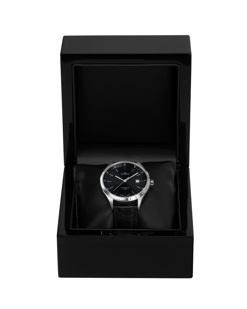 Dette er et nydelig sveitsisk ur som enhver mottaker vil være stolt av å bære. Uret er utstyrt med et automatisk presisjonsurverk. Klokken har safirglass som er en meget hard glasstype og dermed tilnærmet ripesikkert, noe som vil holde den pen i mange år. På baklokket er det plass til å gravere ønsket tekst.